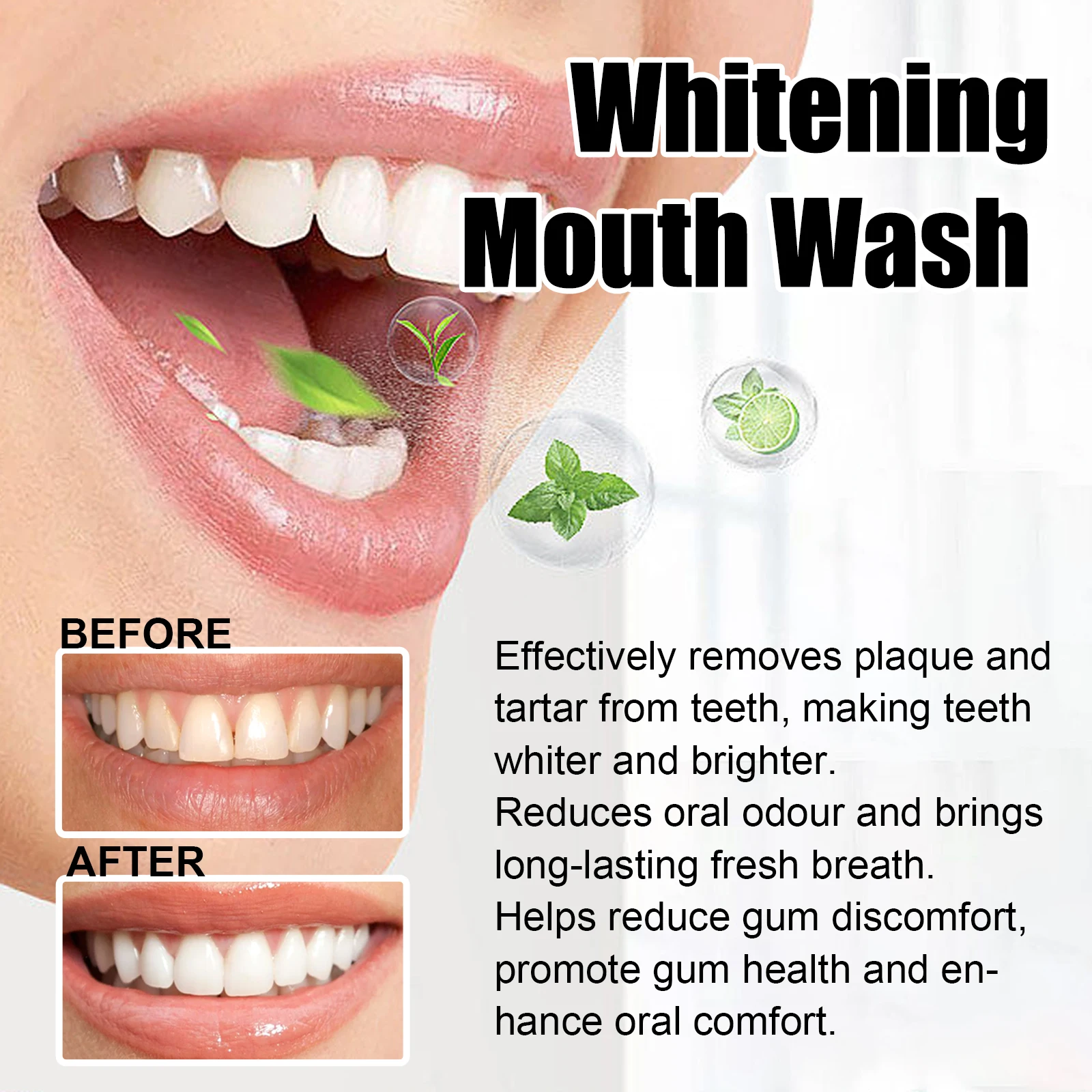 1. Our Coconut Mint Mouthwash, a one-of-a-kind whitening mouthwash for adults, contains coconut oil and peppermint leaf extract. Formulated with all-natural organic coconut oil and peppermint leaf extract, it offers a new way to care for your mouth. It forms a luxurious, smooth coating on teeth, protecting gums, eliminating bad breath, and whitening teeth. It's free of unnecessary ingredients and has a slightly spicy taste. Includes a 100ml bottle of mouthwash and a tongue scraper.