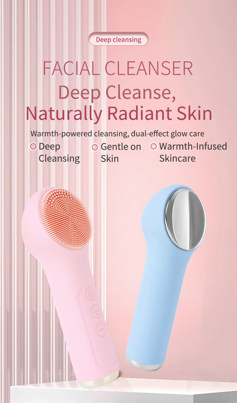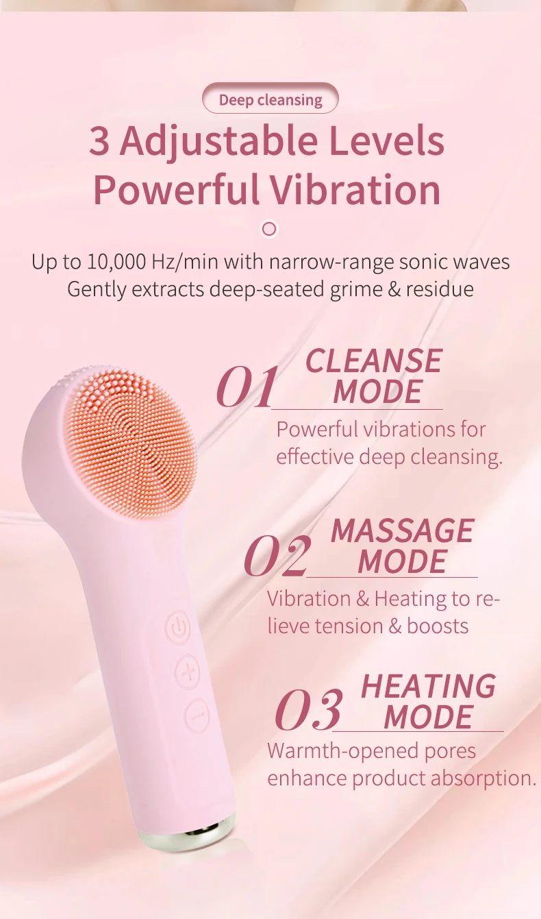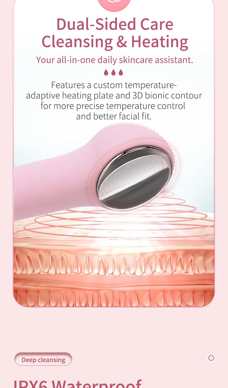 【Dual-Sided Functionality】: Cleansing side (sonic vibrations) + Heating side (spa massage). Experience deep cleansing with our innovative dual-sided silicone facial brush, tailored for various skin types.